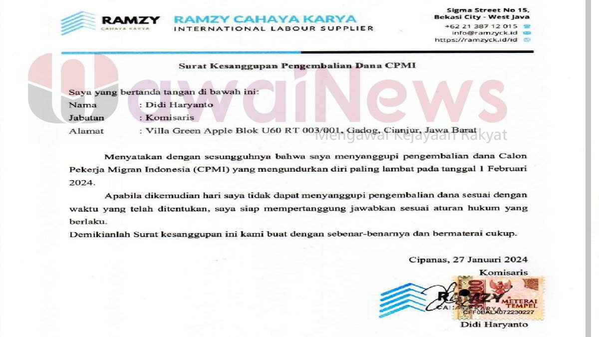 Perlu diketahui, PT. RCK berjanji akan menyerahkan uang 40 orang CPMI paling lambat pada Kamis 1 Februari 2024. itu sesuai surat pernyataan yang ditandatangani oleh Komisaris PT. RCK.