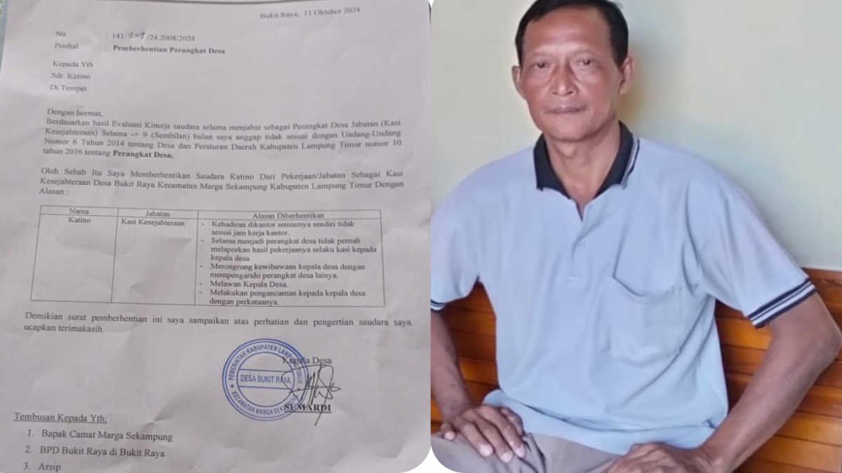 LAMPUNG TIMUR – Lagi, pemberhentian aparatur desa secara sepihak terjadi di wilayah Kecamatan Marga Sekampung, Lampung Timur. Kali ini terjadi di desa Bukit Raya, Kaur Kesra bernama Katino yang diberhentikan tanpa sebab oleh si Kades bernama Sumardi.