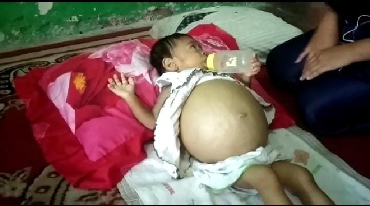 Akibat penyakit tersebut bagian perutnya tampak membesar buncit sehingga butuh dilakukan tindakan medis guna mengobatinya, namun ayah bayi berprofesi sebagai buruh dan tinggal menumpang dirumah orangtuanya dalam keadaan yang kekurangan.