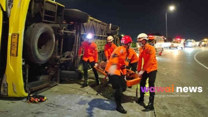 Dugaan sementara, pengemudi kehilangan kendali, sehingga bus menghantam pembatas jalan dan terguling hebat. Jalur yang seharusnya menjadi pintu keluar tol berubah menjadi titik akhir perjalanan.