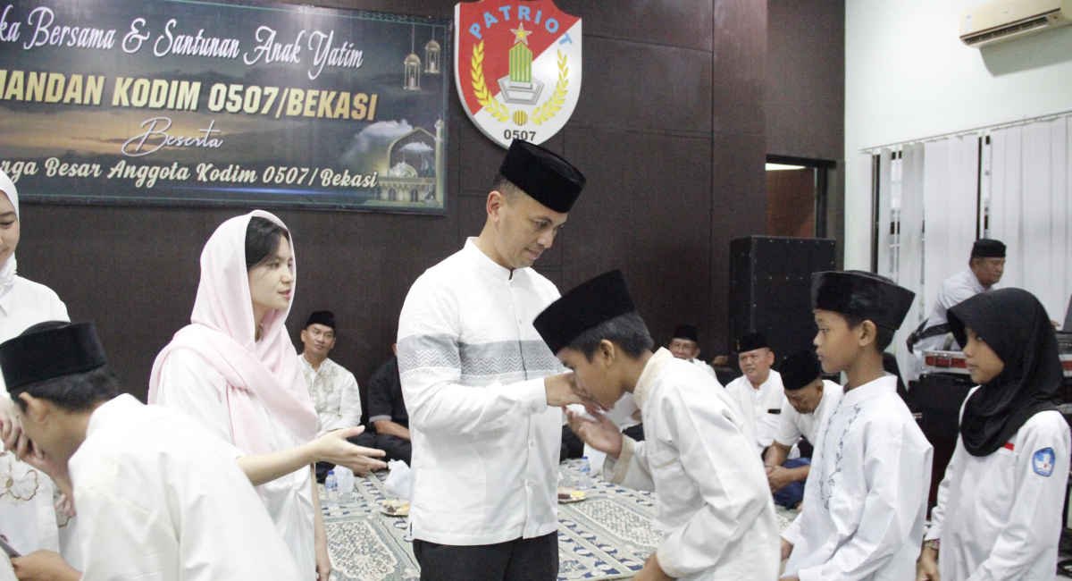 KOTA BEKASI — Komandan Kodim (Dandim) 0507/Bekasi, Kolonel Arm Rico Ricardo Sirait menggelar buka puasa bersama dan memberikan santunan kepada anak yatim di Aula Makodim 0507/Bekasi, Kelurahan Marga Jaya, Bekasi Selatan, Minggu (23/3/2025).