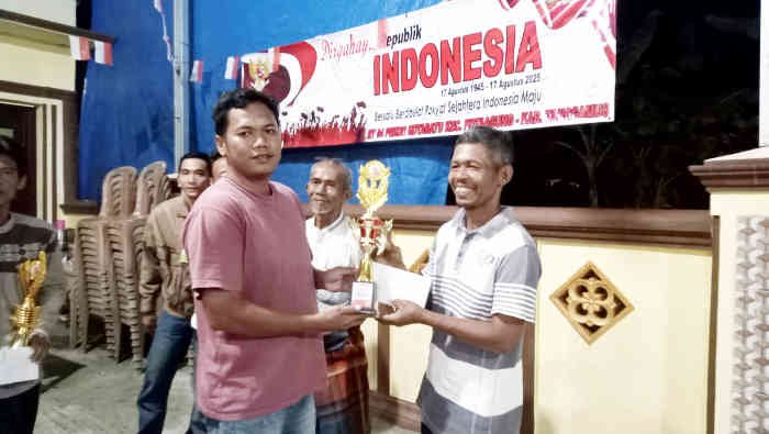 Foto: Agus Salim, ketua panitia sekaligus penggerak semangat warga. Dengan suara bergetar penuh syukur, Agus menyebutkan bahwa yang terpenting dari lomba bukan sekadar mencari juara, melainkan merawat persatuan saat menyerahkan piala kepada warga pemenang perlombaan, pada Minggu malam, 17 Agustus 2025.