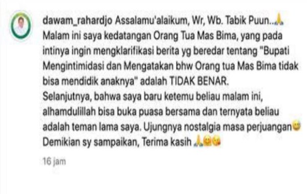 “Assalamualaikum, Wr, Wb. Tabik Puun. Malam ini saya kedatangan Orang Tua Mas Bima, yang pada intinya ingin mengklarifikasi berita yg beredar tentang bupati mengintimidasi dan mengatakan bahwa orangtua Mas Bima tidak bisa mendidik anaknya adalah tidak benar,” tulisnya