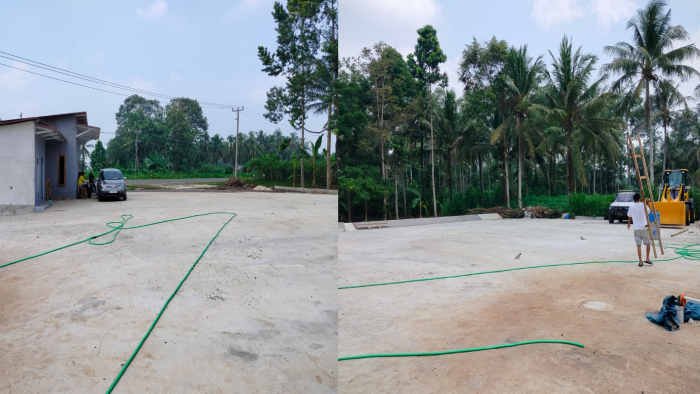 Di halamannya terparkir satu alat berat, diduga untuk membantu proses penataan atau pengolahan bahan baku sabut.