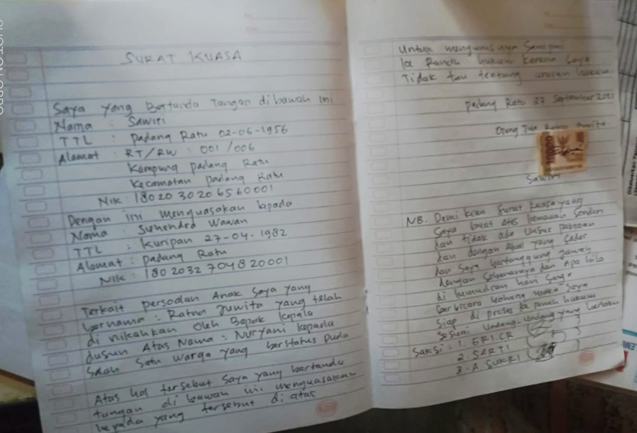 surat kuasa dari orang tua Rj kepada salah satu pengurus LSM di wilayah Padang Ratu agar kasus anaknya dibawa ke ranah hukum diusut hingga tuntas, Rabu (29/9/2021) - Sumantri