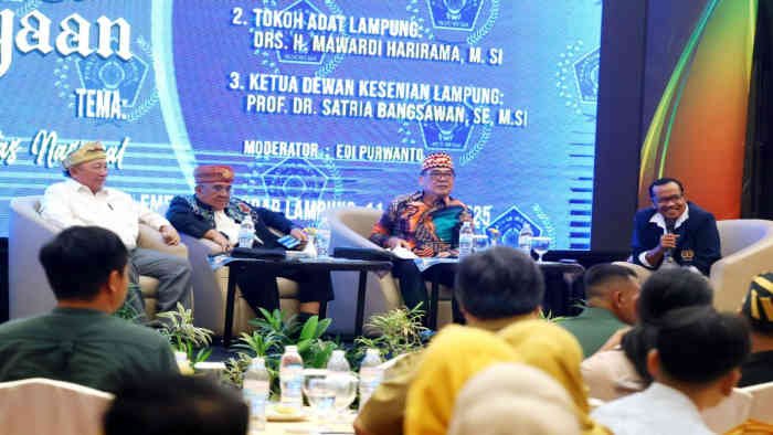 Diskusi ini menghadirkan tiga narasumber: tokoh budaya Lampung Anshori Djausal, tokoh adat Lampung Mawardi Harirama, dan Ketua Dewan Kesenian Lampung Satria Bangsawan. Moderator Edi Purwanto memandu jalannya acara, memastikan diskusi tidak berubah jadi reuni tokoh lama atau lomba nostalgia.