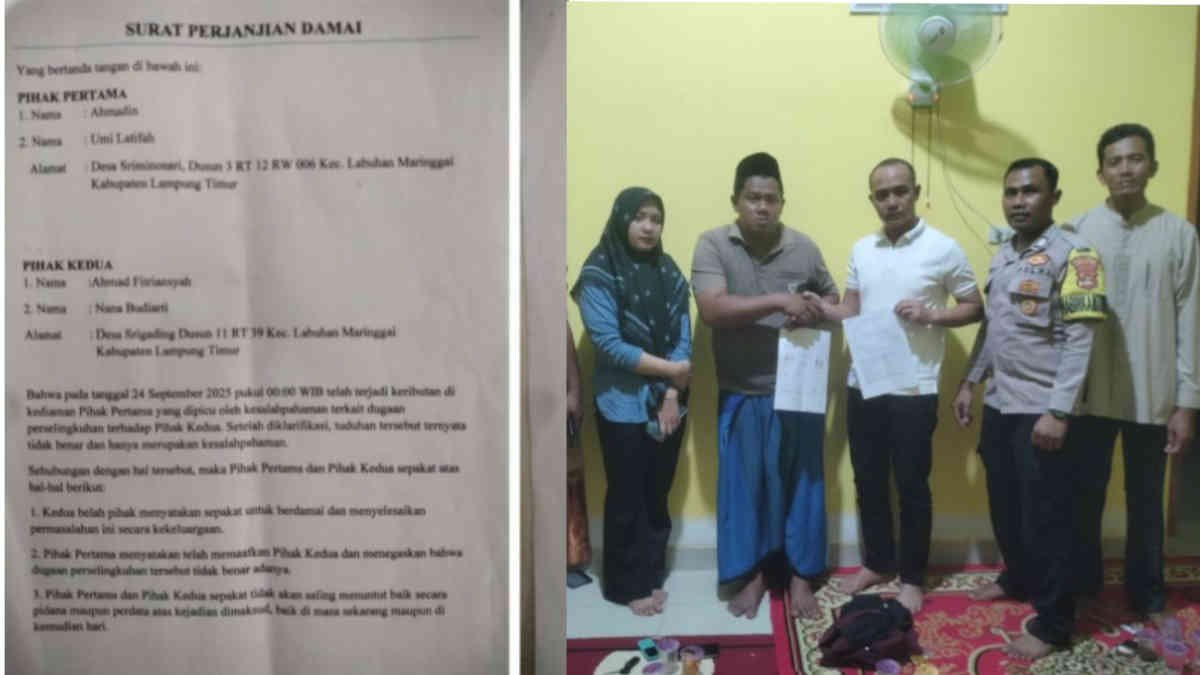 Dalam dokumen tersebut, pihak pertama atas nama Ahmadin bersama istrinya Umi Latifah, yang diketahui sebagai aparatur desa Sriminosari serta pihak kedua Ahmad Fitriansyah anggota DPRD Lampung Timur belakangan diketahui anggota dari Fraksi NasDem, bersama istrinya Nana Budiarti, menyatakan perselisihan yang sempat terjadi pada 24 September 2025 pukul 00.00 WIB hanyalah kesalahpahaman.