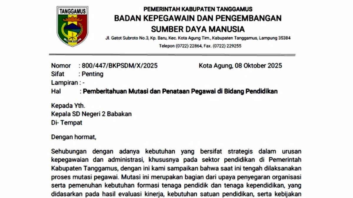 Surat edaran bernomor 800/447/BKPSDM/X/2025 itu mengatasnamakan Badan Kepegawaian dan Pengembangan Sumber Daya Manusia (BKPSDM) Kabupaten Tanggamus. Dokumen yang berkop resmi dan bertanda tangan basah tersebut bertanggal 8 Oktober 2025, dengan cap “Penting” seolah memberi pesan halus bahwa siapa yang tak cepat tanggap, bisa-bisa mutasinya tertinggal rombongan.