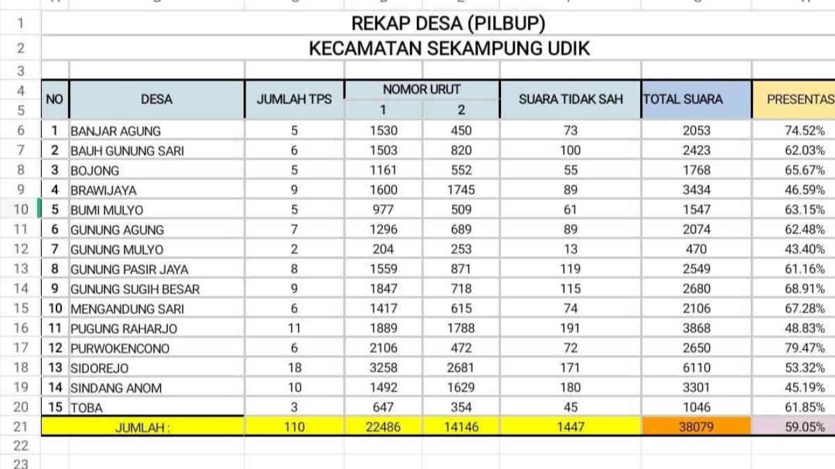 Bahkan berdasarkan rekap Ela-Azwar yang beredar di wilayah Sekampung udik Paslon 01 menang telak dengan perolehan 11,867 suara. Sementara Paslon 02 hanya 7.464 suara.