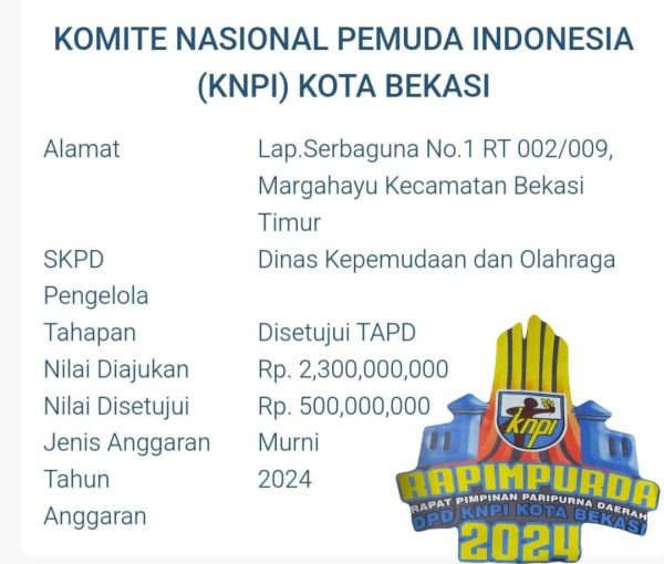 KNPI Kota Bekasi sendiri, sambung Nurhasanah, mendapatkan pencairan dana hibah sekitar Rp 500.000.000 dari nilai yang diajukan sebesar Rp 2.300.000.000. Kepemimpinan Mardani sudah cacat moral sebagai Ketua KNPI Kota Bekasi, Organisasi KNPI ini seakan tidak mencerdaskan kepemudaan lagi.