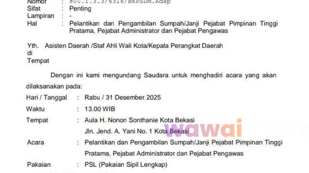 Surat tersebut memuat undangan pelantikan lengkap dengan tata cara pelaksanaan, termasuk ketentuan seragam, yang kemudian memantik spekulasi adanya rotasi dan mutasi lanjutan di tubuh Pemkot Bekasi.