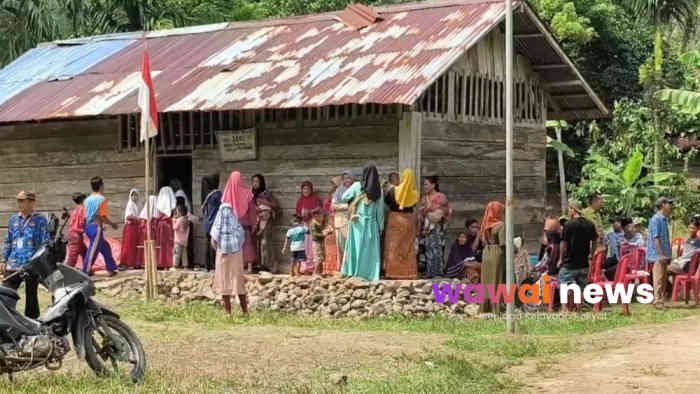 Bangunan tersebut merupakan “kelas jauh” dari SDN 1 Tanjung Raja. Di dalam satu ruangan sempit, 15 siswa dari kelas 1 hingga kelas 6 belajar tanpa sekat.
