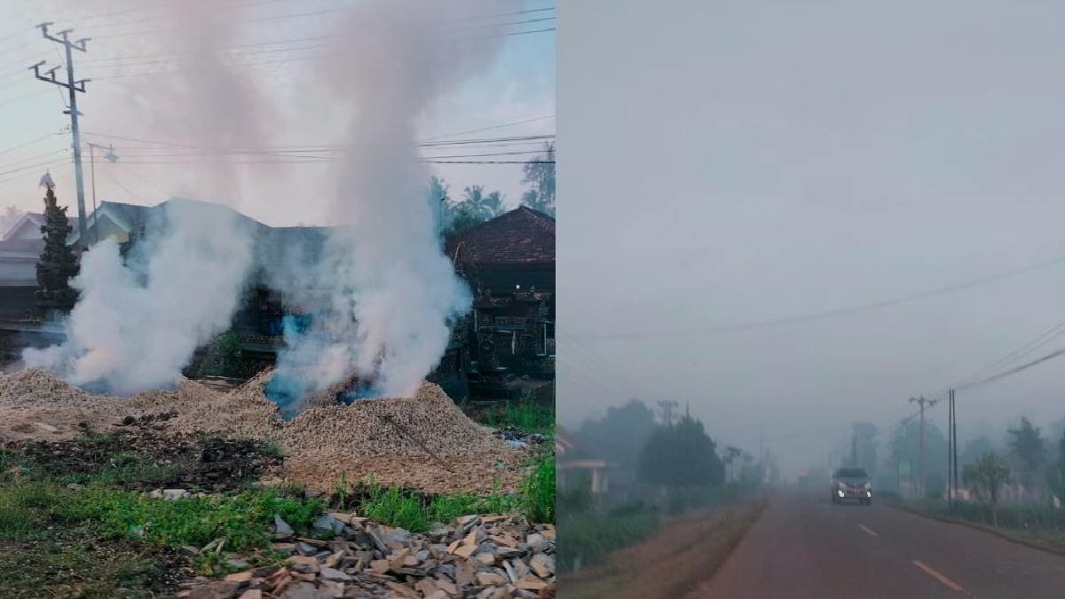 Pemandangan asap sisa pembakaran limbah jagung jadi hal biasa. Akan lebih terasa saat melintasi pagi hari usai sahur dan salat subuh kepungan asap ditengah rinai embun pagi terlihat cukup tebal, bau asap limbah jagung menyeruak ke penciuman.
