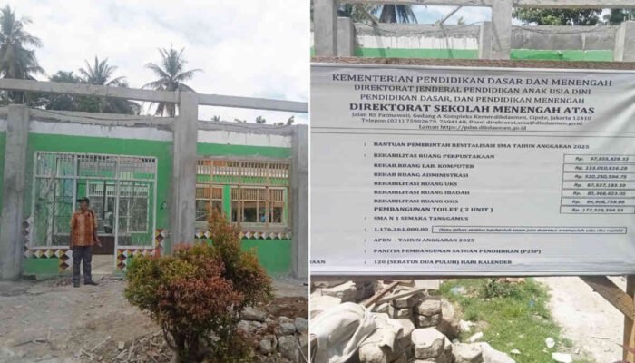 Foto: Pengerjaan Proyek revitalisasi gedung SMA Negeri 1 Semaka, Kabupaten Tanggamus, Lampung, bernilai lebih dari Rp1 miliar, (foto_kolase)