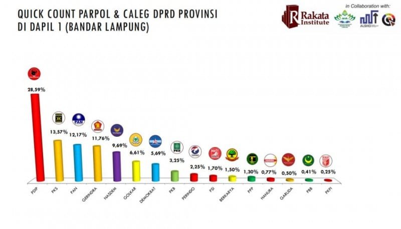 PDI Perjuangan menjadi partai pemenang dalam pemilihan umum (Pemilu) 2019 untuk DPRD Provinsi Lampung dengan perolehan 19 kursi versi Rakata Institute, bekerja sama dengan Lembaga Survei Kuadran, ALSHCI dan Unit Riset dan Publikasi Ilmiah (URPI) – Universitas Islam Negeri Raden Intan Lampung.