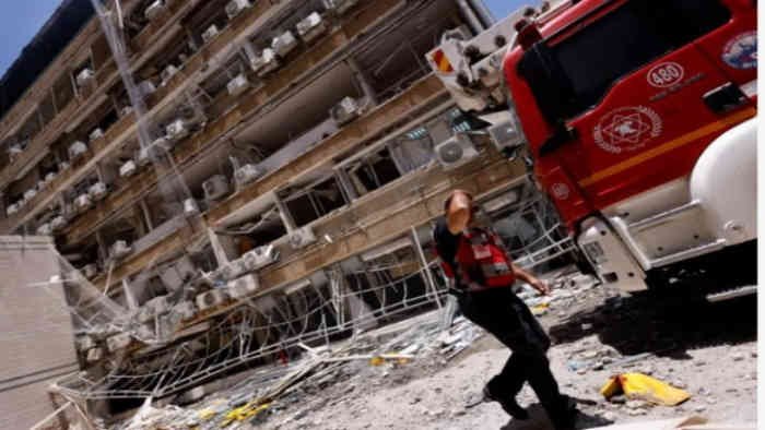 Rekaman bergulir dari pangkalan Magen David Adom (MDA) menunjukkan api pekat mengepul dari mobil dan bangunan rusak, sementara layanan penyelamat berjibaku menjinakkan api