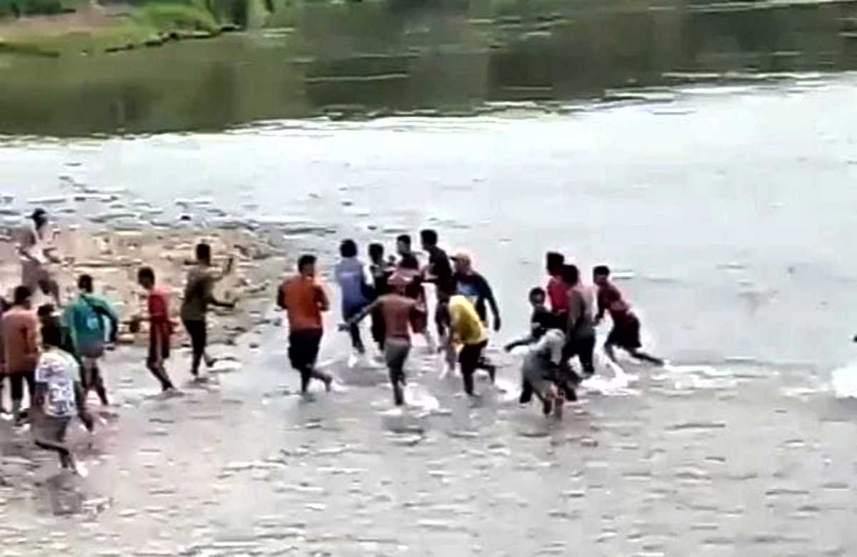 Kejadian mengerikan itu terekam dalam video yang kini viral di media sosial. Puluhan warga tampak berdiri di bibir sungai, tegang dan penuh waspada, menyaksikan sosok buaya besar yang muncul ke permukaan air dengan jasad Mbah Wasim masih mencengkeram erat dalam rahangnya.