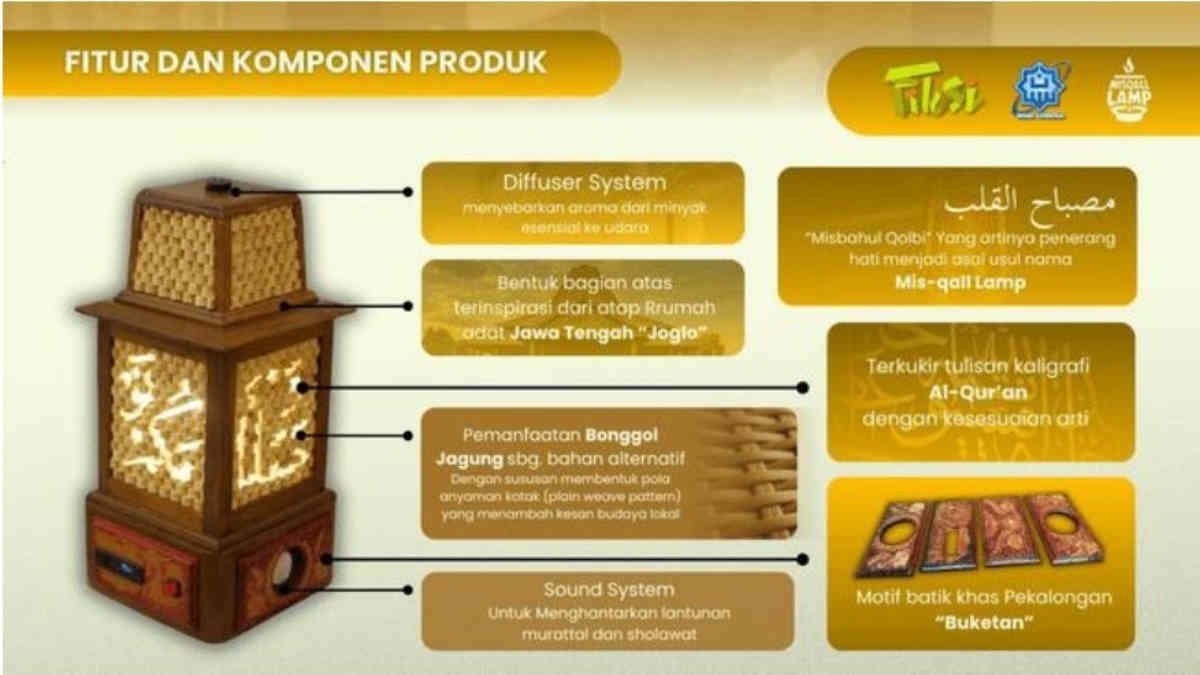 Desain lampu ini tidak asal “nyala, wangi, dan islami”. Bentuknya terinspirasi atap rumah Joglo, simbol keterbukaan dan keseimbangan hidup. Bahannya? Bonggol jagung yang dipadatkan, dilapisi motif batik Pekalongan dan kaligrafi Al-Qur’an.