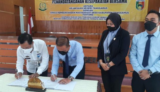 WAWAINEWS – Kepala Kejaksaan Negeri (Kejari) Tanggamus bersama Dinas Pemberdayaan Masyarakat Desa (PMD), saling menandatangani nota kesepakatan bersama, Rabu (26/1/2022).
