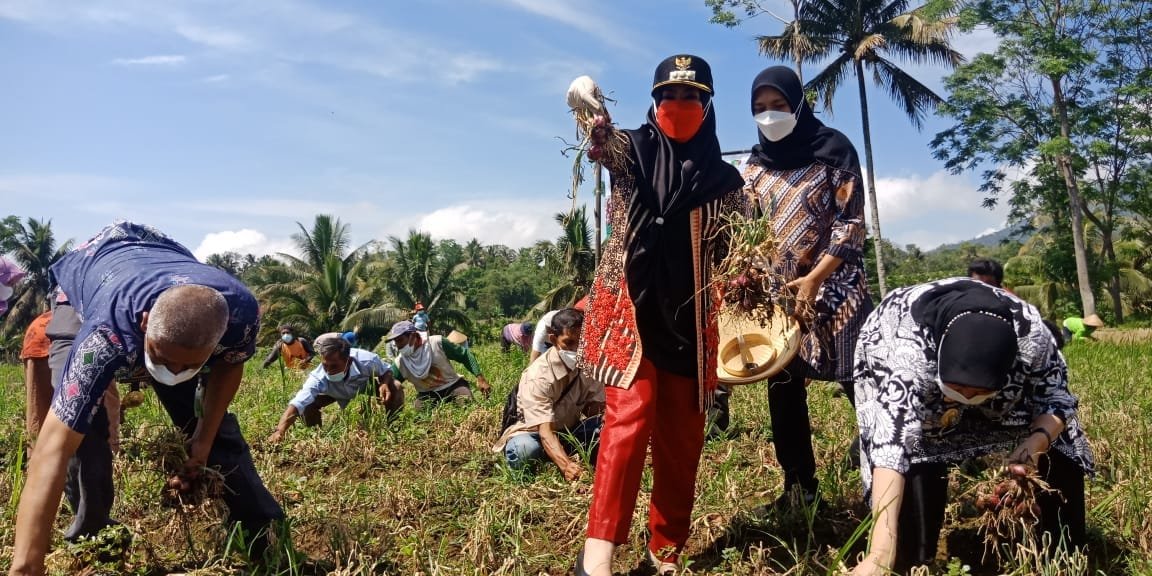 Bupati Tanggamus Dewi Handajani, melaksanakan Panen Bawang Merah di Pekon Simpangkanan, Kecamatan Sumberejo, Jum'at (10/9/21)- foto ist
