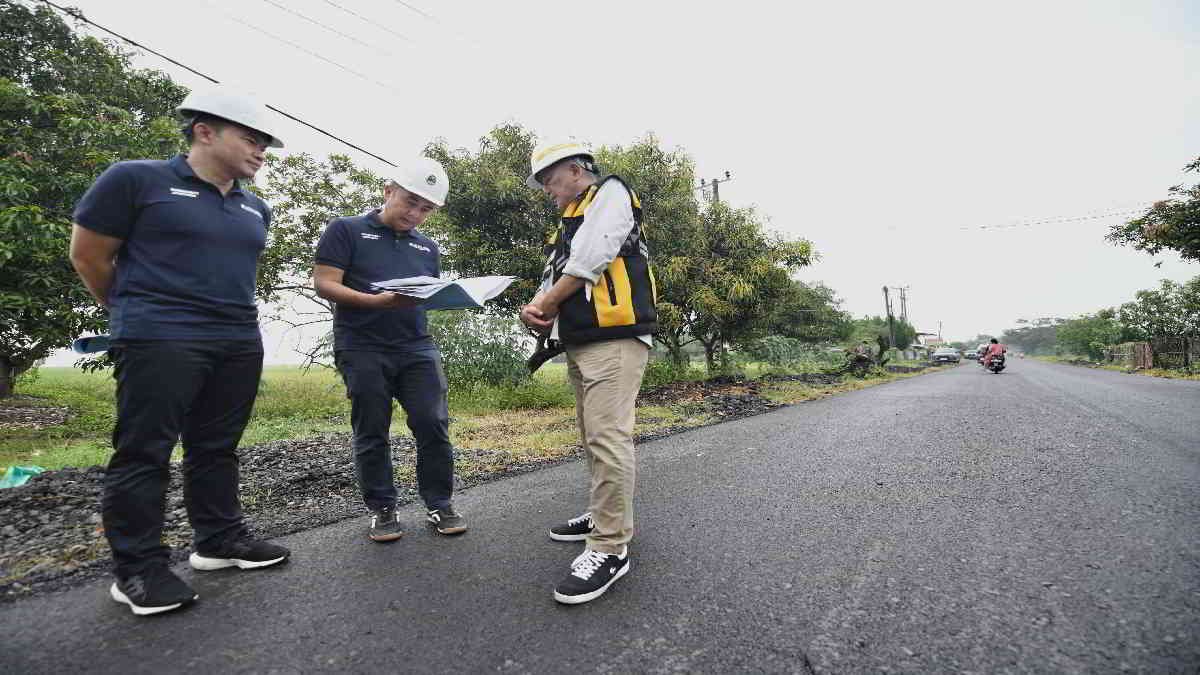 Penjabat Gubernur Jawa Barat Bey Machmudin mengecek proges perbaikan Jalan Tegalgubug – Arjawinangun – Jagapura, di Kabupaten Cirebon, Sabtu (25/5/2024).