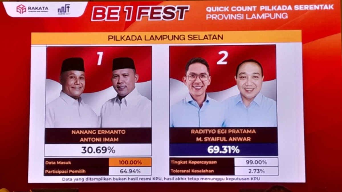 Hal itu berdasarkan Quick Count Rakata berlangsung di Ballroom Hotel Grand Mercure Bandar Lampung, Rabu, (27/11/2024). Hasil quick count ini bukan hasil resmi penghitungan Komisi Pemilihan Umum (KPU) dan masyarakat masih harus menunggu keputusan KPU.