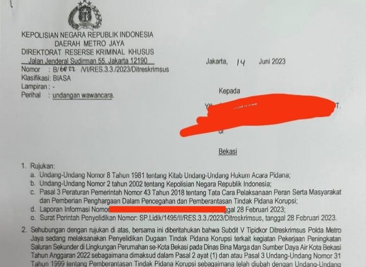 Berbekal laporan tersebut, Polda Metro Jaya memanggil sejumlah pihak, diantaranya para kontraktor serta unsur pejabat Dinas Bina Marga Kota Bekasi.