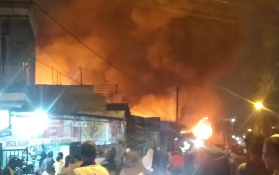BEKASI – Puluhan lapak di belakang pasar baru, jalan Pinang dan jalan Mohamad Yamin, kelurahan Durenjaya, Kota Bekasi, ludes terbakar, Sabtu malam (31/7/2021). Kejadian diperkirakan pukul 21.00 WIB.