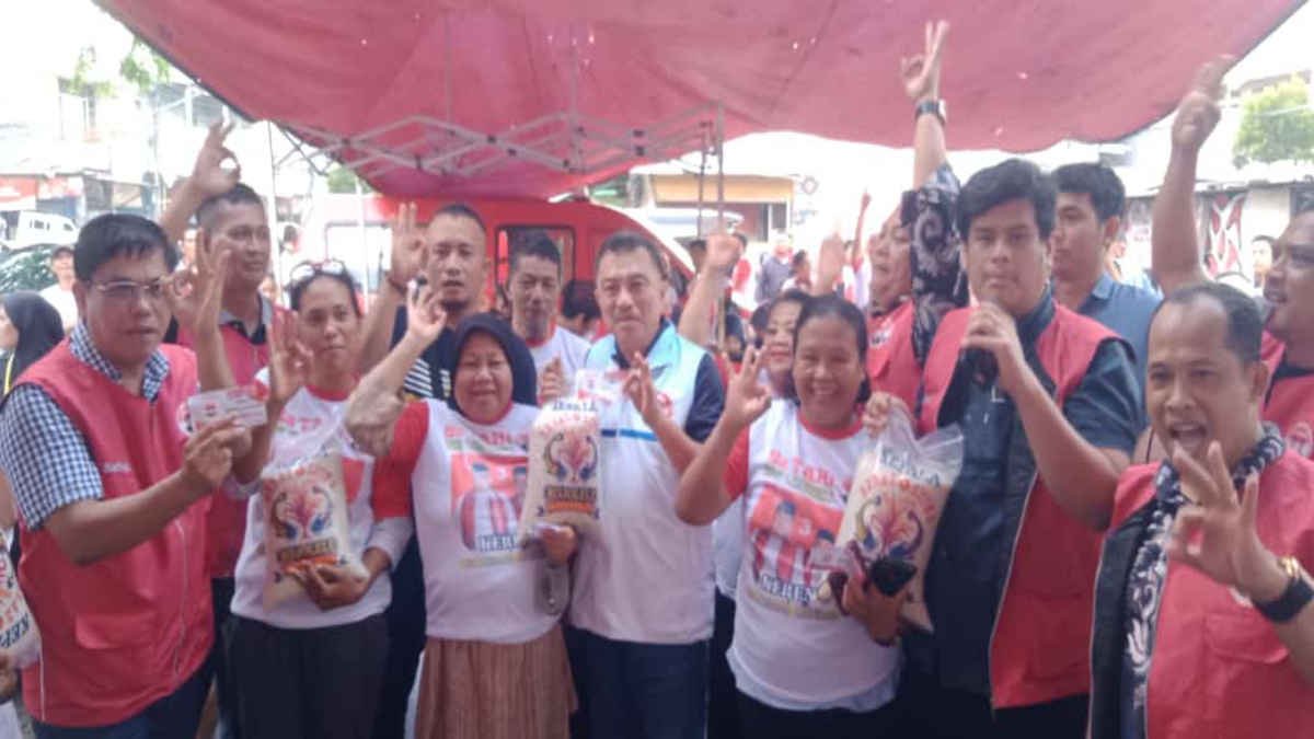 Warga kecamatan Medan Satria antusias saat hadir pada program tebus murah beras 5 kiogram dari SaTAHI yang di hadiri langsung calon wakil Wali Kota Bekasi Abdul Harris Bobihoe di pangkalan 31 Taman Harapan Baru.