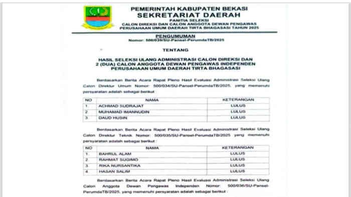 BEKASI – Harapan publik akan pelayanan air bersih yang lebih jernih, proses seleksi calon Direksi Perumda PDAM Tirta Bhagasasi justru menimbulkan aroma keruh. Bukan karena kualitas air, tapi karena kualitas calon-calon direksinya.