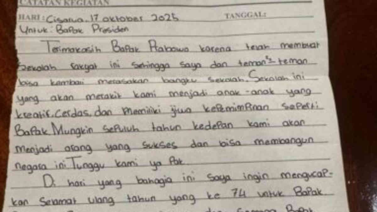 Dalam keterangan tertulis yang dirilis Sekretaris Kabinet (Seskab) Teddy Indra Wijaya pada Jumat, 24 Oktober 2025, disebutkan bahwa surat sederhana namun menyentuh hati itu ditulis tangan oleh Muhammad Daffa Raasyid, siswa Sekolah Rakyat Menengah Pertama II Bandung Barat. Kertasnya mungkin tipis, tapi maknanya tebal karena ditujukan langsung kepada Presiden Republik Indonesia.