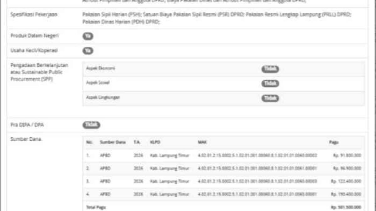 Berdasarkan data Sirup.Inaproc, pada tahun anggaran 2026, belanja pakaian dinas dan atribut DPRD Lampung Timur mencapai Rp501.500.000. Anggaran tersebut saat ini telah masuk tahap e-Purchasing dan diperuntukkan bagi anggota DPRD dari berbagai fraksi.