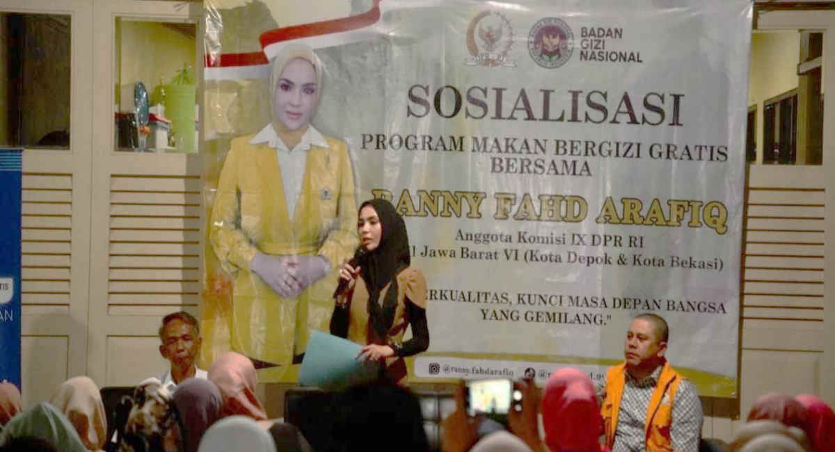 KOTA BEKASI – Anggota DPR RI Komisi IX daerah pemilihan Kota Bekasi-Depok, Ranny Fahd Arafiq, menggelar Sosialisasi Makan Bergizi Gratis (MBG) di Jln. Makrik No. 74, Bojong Rawalumbu, Selasa (11/3/2025).