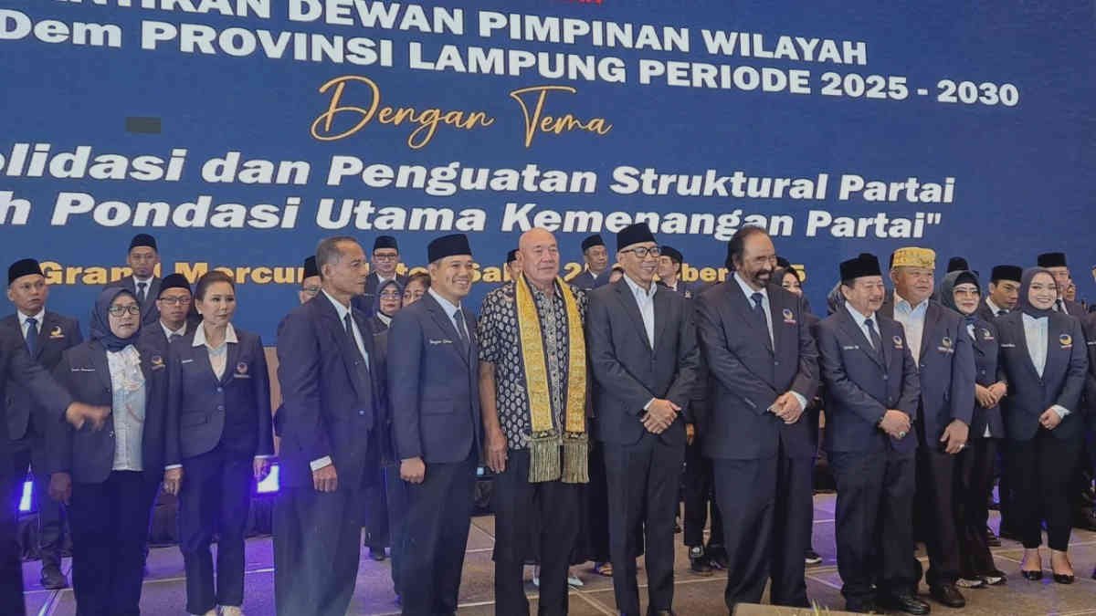 BANDAR LAMPUNG – Ketua Umum Partai NasDem Surya Paloh resmi melantik Dr. (H.C.) Drs. H. Herman HN, MM sebagai Ketua DPW Partai NasDem Provinsi Lampung periode 2025–2029. Pelantikan digelar di Hotel Grand Mercure, Bandar Lampung, Sabtu (25/10/2025), dan dihadiri Sekjen DPP NasDem Hermawi Taslim, Waketum Saan Mustopa, serta ribuan kader NasDem dari seluruh Lampung.