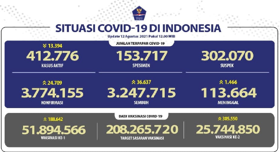 JAKARTA- Hari ini, 12 Agustus 2021, Indonesia mencatat angka kematian sebesar 1.466 orang menjadikan jumlah kematian akibat COVID 19 di Indonesia menjadi 113.664 atau 3,011 persen dari total kasus ditengah ramainya kritik pemerintah karena penghapusan angka kematian pada indikator penanganan COVID 19