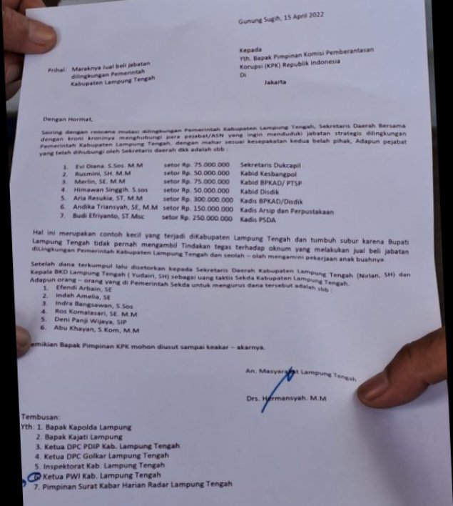 Setidaknya dari 7 nama yang tertera di surat jual beli jabatan di Lingkungan Pemkab Lampung Tengah tertanggal 15 April 2022 itu lima diantaranya telah dikonfirmasi. Namun inspektorat belum membuka hasil pemeriksaan secara gamblang.