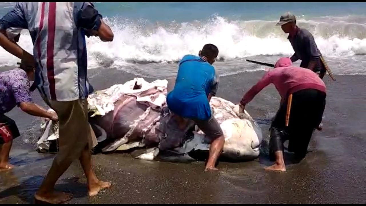 Biota laut yang diperkirakan berukuran panjang 4-6 meter dengan bobot mencapai 1,5 – 2 ton didapati oleh warga sekitar Pantai Cirarangan (nelayan pinggir) yang akan menjala ikan di Desa Talagasari Kecamatan Sindangbarang Kabupaten Cianjur dalam kondisi sudah mati.